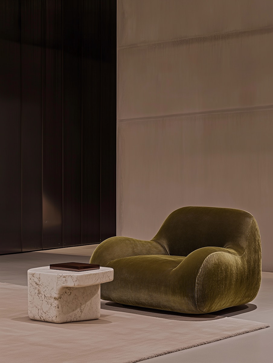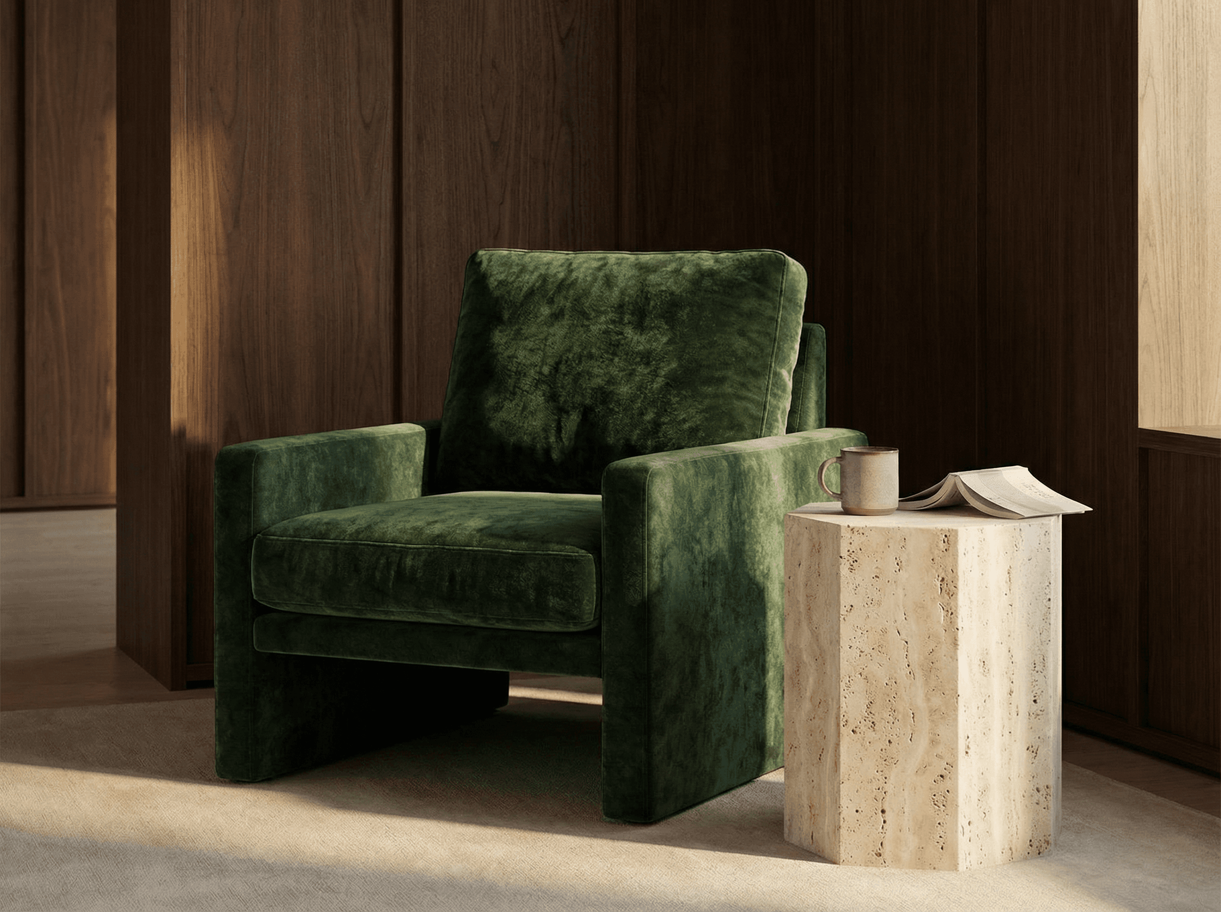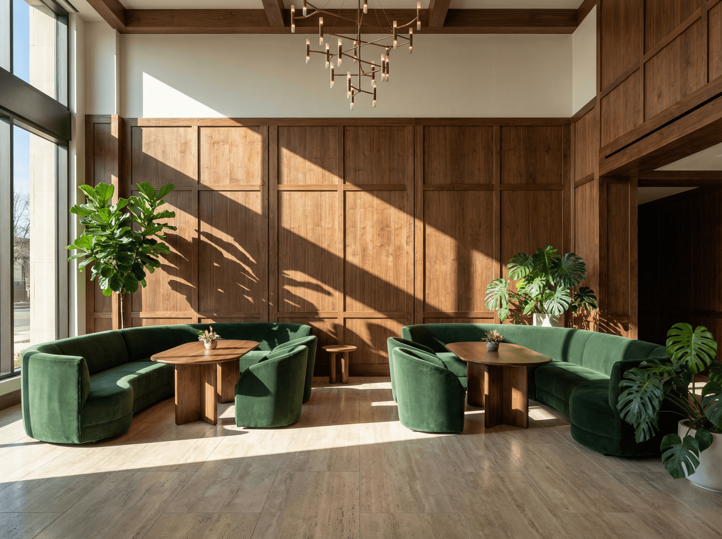 The project integrates walnut architectural paneling, travertine surfaces, and deep-toned upholstered seating to establish a grounded and durable environment. Each furniture element is proportioned to anchor the space without visual excess, reinforcing clarity within large volumes.