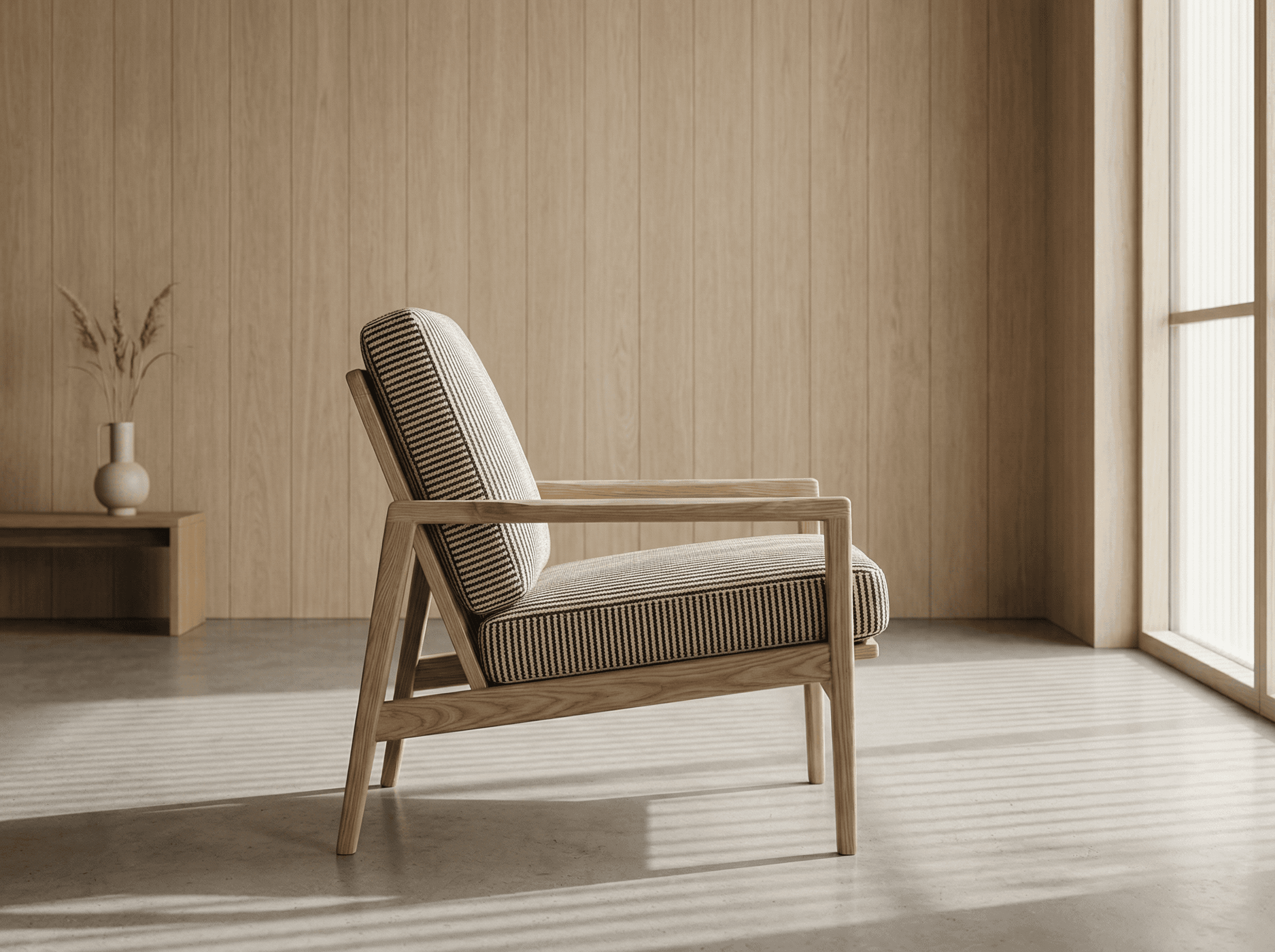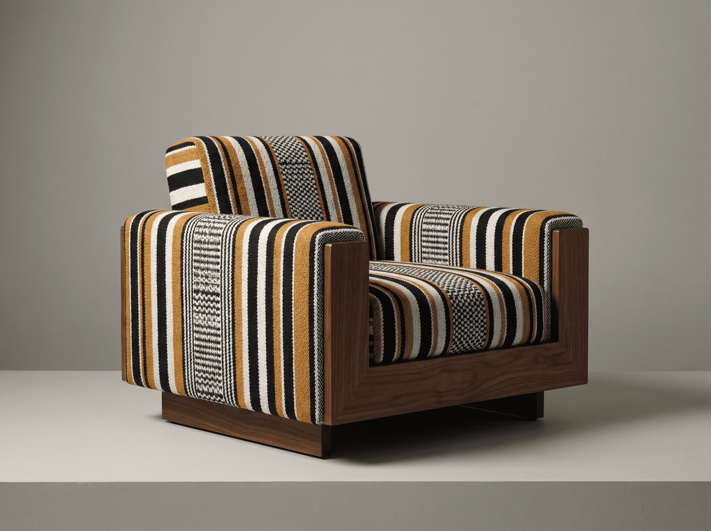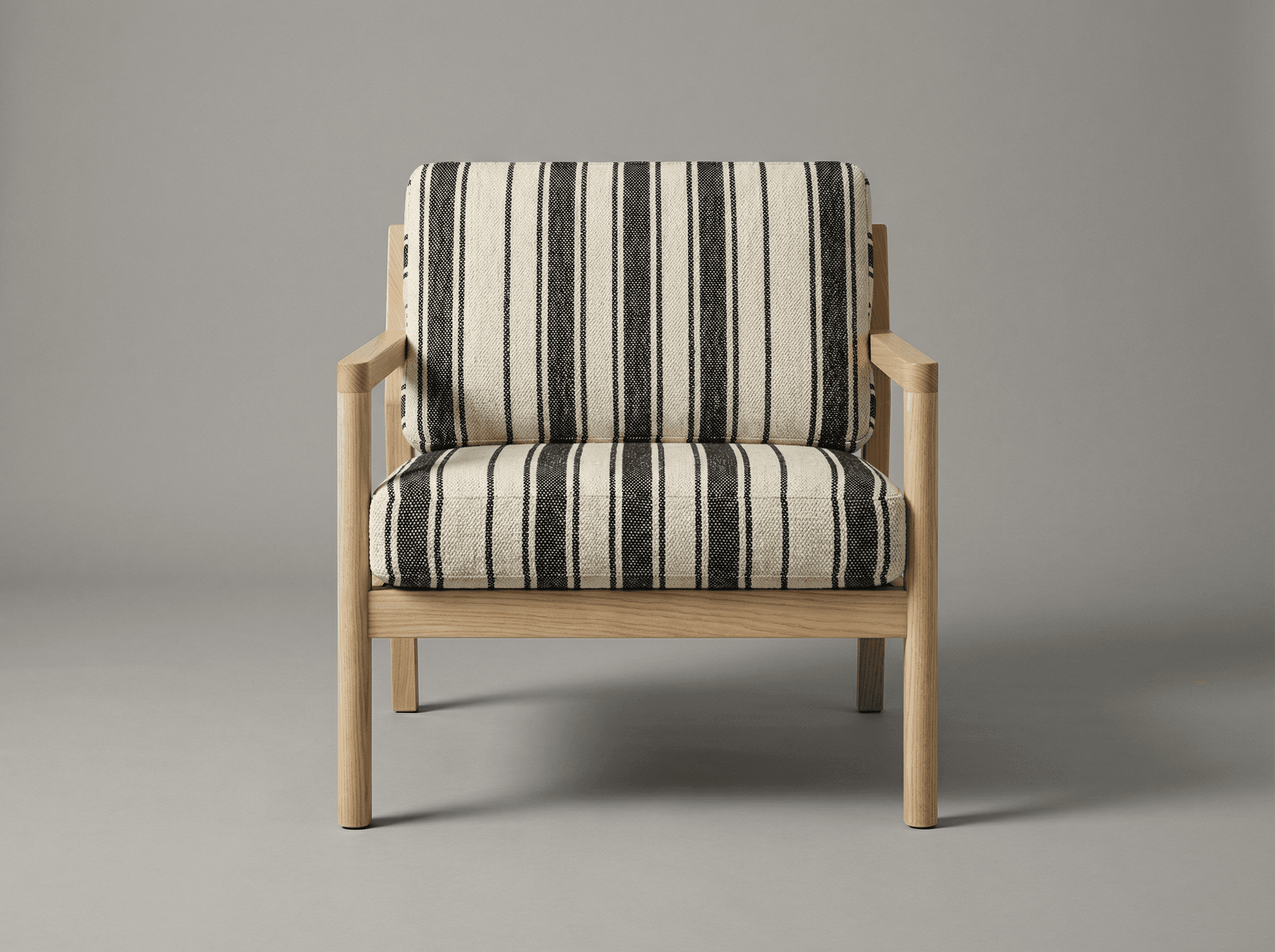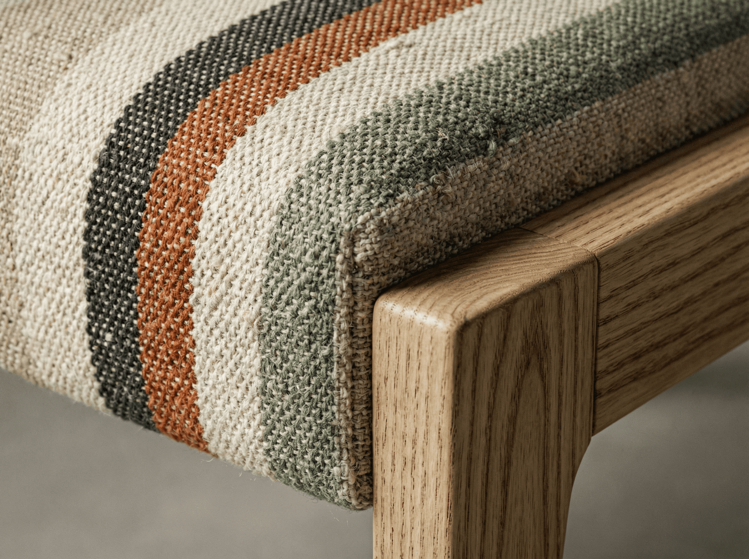 The collection focuses on lounge seating and compact benches, pairing striped woven upholstery with precision-crafted ash and beech frames. The intention was to balance visual rhythm with structural clarity — allowing bold surface pattern to sit within disciplined joinery.